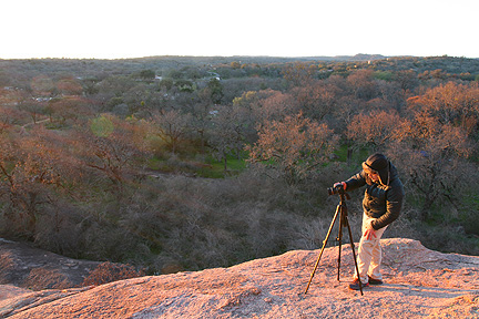By the time I reached the base of the dome sunlight was already hitting the tops of the boulders. I took one last scan of the area, located the largest most interesting boulders and headed straight for them. It only took a few minutes to hike up to the spot near the huge rocks. I was somewhat surprised to see another photographer already there, I took a quick shot of him ( image # 5 ) turned around and started to focus on the amazing landscape in front me. |